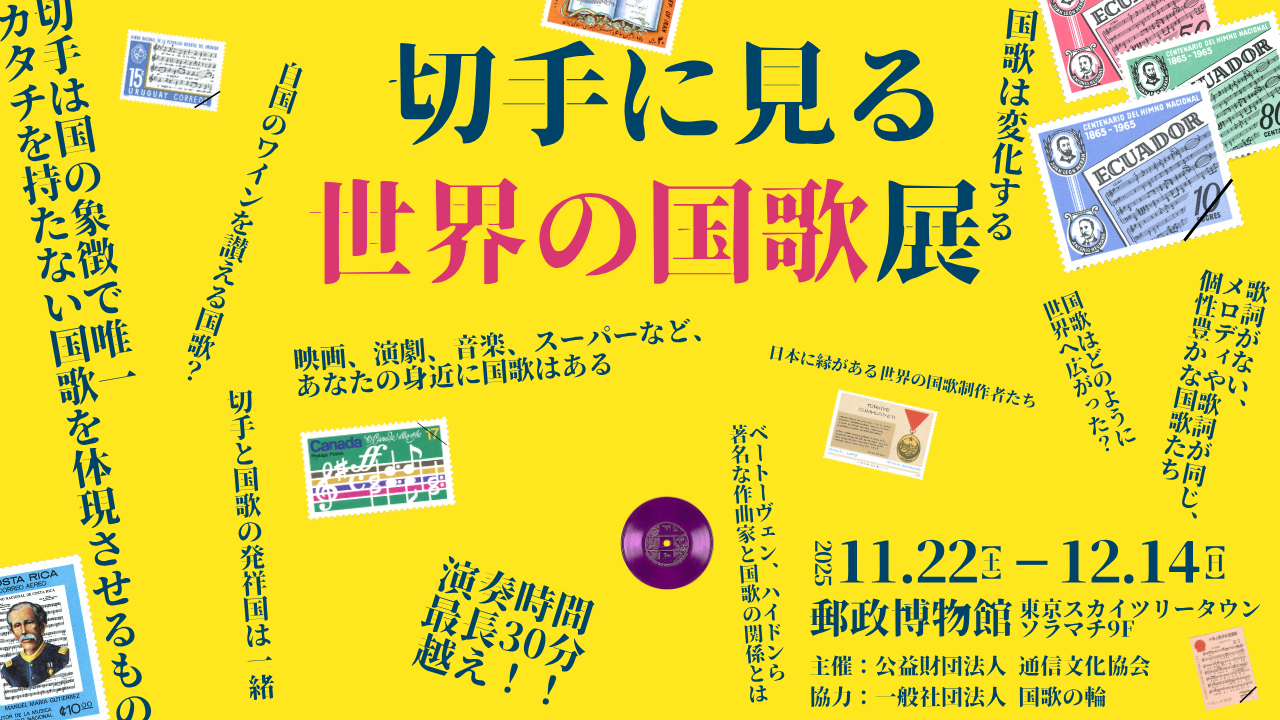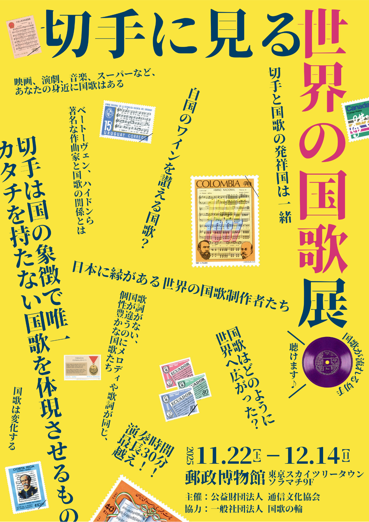 「切手は小さな博物館」と言われるほど、多様な意匠が特徴の一つ。当館では、常時33万種類の世界の切手を国ごとに展示していますが、この「切手に見る世界の国歌展」は、当館初の「切手」と「国歌」をテーマにした展覧会です。